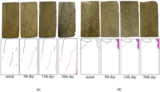 After soaking in different solutions, some specimens with primary cracks develop well in the stress-free state. Specifically, after immersion in deionized water, the extension of primary cracks and the initiation of new cracks are obvious with the increase of immersion time, as shown in Figure 9a. After immersion in the acid solution, only the local block spalling along the primary fracture occurred in the initial immersion stage. After the immersion time was prolonged, the original cracks on the surface are intermittently closed and opened, as shown in Figure 9b. The macroscopic phenomenon is almost consistent with the microscopic porosity results.