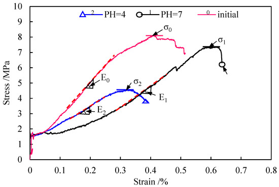 After immersion, uniaxial compression tests were performed on the intact specimens. The results show that the peak strength of the samples soaked in the two solutions is significantly lower than that of the original samples. However, the strength of the sample soaked in acid solution decreases more obviously. The soaking process prolonged the compression process of the sample in the elastic stage, and the elastic modulus of the sample showed different degrees of influence. Although immersion in deionized water has the greatest influence on the process of elastic compression, the influence on the magnitude of elastic modulus is less than that in acid solution, as shown in Figure 10.