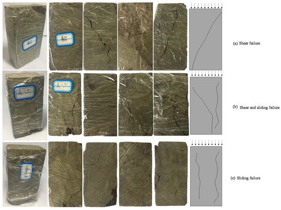 On the other hand, the failure characteristics of the specimens soaked in different solutions are different from those of the original samples. Under uniaxial compression, the specimens without any treatment exhibit typical shear failure mode, as shown in Figure 11a, and the specimens immersed in acid solution for a long time show a sliding failure mode under uniaxial compression as shown in Figure 11c. However, the specimens immersed in deionized water for a long time contain both shear and sliding failure characteristics, as shown in Figure 11b.