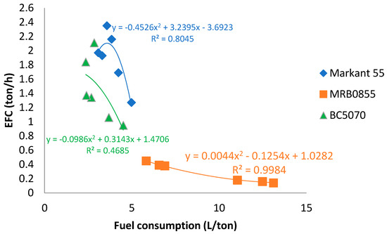 The graphs in Figure 2 show the relationship between EFC and fuel consumption (L/ton). The best fit line of EFC (Y-axis) and fuel consumption (X-axis) of the STAR MRB0850BT baler used on scattered rice straw at IRRI showed a higher correlation coefficient (R2 = 0.9984) than the Markant 55 baler (R2 = 0.8045) and New Holland BC5070 baler (R2 = 0.4612), which means that the STAR MRB0850B baler performed at a lower EFC of 0.28 ton/h and a higher fuel consumption of 9.08 L/ton compared to the Markant 55 and BC5070, which performed at a higher EFC of 1.9 ton/h and 1.51 ton/h, respectively; and a lower fuel consumption of 3.8 L/ton and 2.48 L/ton, respectively.