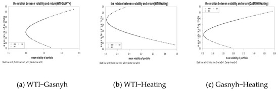 Owing to the limited space, Table 4 only lists the mean values of the return and volatility of 19 weight-based portfolios during the estimate period for three oil market portfolios by using the CW method, and the data for the others market types of portfolios are available upon request. Figure 1 illustrates the relation between return and volatility for three oil market portfolios. From each of subfigures of Figure 1, I observe a curve connecting the 19 points corresponding to the 19 weight-based portfolios has the shape of a parabolic on the risk–return space. For example, the return and volatility data of 19 weight-based portfolios listed in columns ‘WTI–GasNyh’, ‘WTI–Heating’, and ‘GasNyh–Heating’ of Table 4 are used to plot a parabolic curve in Figure 1a–c, respectively. The portfolio at the nose of the parabolic curve is the minimum variance portfolio (MVP) because it has the minimum risk among the 19 weight-based portfolios. The efficient frontier is on the upper–right portion of the MVP of parabolic curve, and all the weight-based portfolios on the efficient frontier are effective. On the contrary, all the weight-based portfolios on the lower–right portion of the MVP of parabolic curve are ineffective. From Table 4, I can observe that, regarding the WTI–GasNyh portfolio, the portfolio corresponding to the weight combination (, and ) has the smallest level of volatility (1.9938) among the 19 weight-based portfolios, suggesting that and are the weight combination of portfolio on the nose of efficient frontier, the MVP, for this bi-component assets portfolio. Moreover, w1 ≤ 0.7(= ) and respectively are the weight range of the first and second component assets of all portfolios on the efficient frontier because the portfolios corresponding to the weight range (or ) have the greater return than those corresponding to the weight range (or ). By the same inference process, for the WTI–Heating portfolio, and are the weight combination of MVP, and and respectively are the weight range of the first and second component assets of all portfolios on the efficient frontier. For the GasNyh–Heating portfolio, and are the weight combination of MVP, and and respectively are the weight range of the first and second component assets of all portfolios on the efficient frontier. Subsequently, for the three oil market portfolios, the messages of the efficient frontier are summarized in Panel A of Table 5. The above messages include the MVP weight combination ( and ) and its corresponding return () and volatility (), and the weight range of component assets of all portfolios on the efficient frontier (e.g., for WTI–GasNyh portfolio). By imitating the above–mentioned process, Panels B–E of Table 5 summarize the messages of the efficient frontier for the three stock market portfolios, nine mixed oil–stock market portfolios, three mixed oil-FX market portfolios, and three mixed stock-FX market portfolios, respectively. Moreover, Table 5 also lists the values of coefficient of variation (CV) for the above–mentioned MVPs.