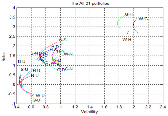 The relative location of efficient frontier’s nose for 21 bi-component portfolios. Note: In this figure, ‘W’, ‘G’, ‘H’, ‘S’, ‘D’, ‘N’, and ‘U’ denote the West Texas intermediate (WTI), GasNyh, Heating, SP500, DJ, Nasdaq, and UDI, respectively. Hence, ‘G–H’ denotes a bi-component portfolio that is constructed by the GasNyh and Heating.