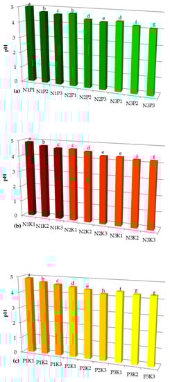 The interaction effect between NP (a) NK (b) and PK (c) on soil pH. N1—120 kg N ha−1, N2—240 kg N ha−1, N3—360 kg N ha−1, P1—34.9 kg P ha−1, P2—69.8 kg P ha−1, P3—104.7 kg P ha−1, K1—83 kg K ha−1, K2—166 kg K ha−1, K3—249 kg K ha−1. The same letter means not significantly different.