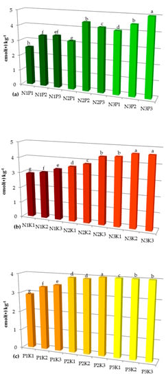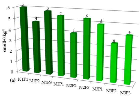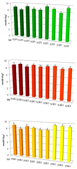 The interaction effect between NP (a) NK (b) and PK (c) on Cation Exchange Capacity (CEC) in the soil. N1—120 kg N ha−1, N2—240 kg N ha−1, N3—360 kg N ha−1, P1—34.9 kg P ha−1, P2—69.8 kg P ha−1, P3—104.7 kg P ha−1, K1—83 kg K ha−1, K2—166 kg K ha−1, K3—249 kg K ha−1. The same letter means not significantly different.
