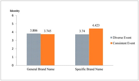 To examine the effect of a MICE venue’s type of name and the characteristics of the MICE event consistency in building the identity of the MICE venue, this study executed its analysis based on a two (MICE brand name) by two (MICE event) between-subjects ANOVA on identity. There were marginally significant main effects for the type of MICE venue’s name (F(1, 202) = 2.961, p < 0.1) and event consistency (F(1, 202) = 3.060, p < 0.1) in building identity. The two-way interaction between the type of MICE venue name and event consistency on identity was significant (F(1, 207) = 4.379, p < 0.05) (see Figure 2).