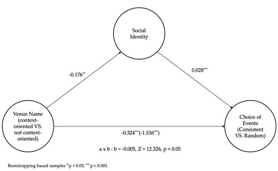 In order to investigate whether social identity mediated the effect of venue name on schedule choices, we used predicted values of schedule choices as dependent variables which were calculated through GEE. We used a bootstrapping method (Hayes model 4; 5000 iterations) []. As hypothesized, the social identity mediates the effect of venue name on the predicted value of schedule choices (β = −0.005, 95% CI = −0.0088 to −0.0018). The significant but negative indirect effect with 95% confidence interval suggested that as the venue names become general, the social identity decreases (a = −0.176, t = −3.696, p < 0.01), which would positively influence choosing the option consisting of context-oriented event schedules (b = 0.028 t = 4.51, p < 0.01). The direct effect was also significant (β = −314, 95% CI = −0.3313 to −0.2973) (see Figure 3). Similar to the findings of study 1, the results showed that as the MICE venue name was context-oriented, shared social identity was easily shaped, which mediates participants to choose context-based event schedules for their business.