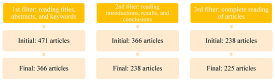 In Figure 2, it can be seen that, at first, there were 471 articles in the search. After reading titles, abstracts, and keywords, this number was reduced to 366 papers, as some of the subjects discussed in the manuscripts were beyond the scope of this research.