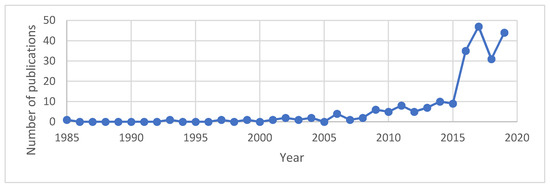 Year of publication: The oldest article in our sample was published in 1985, followed by a publication in 1993. From the 2000s onwards, a greater number of publications in the area have been identified, reaching its peak in 2017 with 47 published works. Figure 3 illustrates the evolution in the number of publications per year of the studies found in the sample. These results confirm that the interest in the research on the economic feasibility of solar/photovoltaic energy in the world has grown especially in the last 10 years.