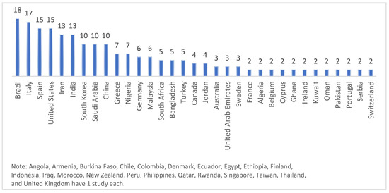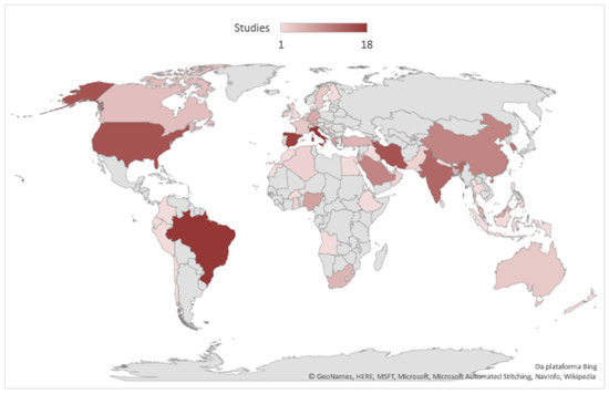 Brazil and Italy are the countries that most appeared in the sample, with 18 and 17 publications, respectively. In addition to Brazil and Italy, countries like Spain, the United States, Iran, and India, for example, appear in the sample with a high number of publications, with at least 13 papers each. Other countries appear with fewer publications, but not less relevant, as shown in Figure 5.