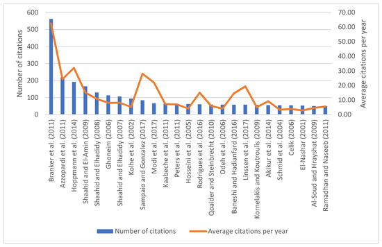 Considering the overall number of citations (562) and the average number of citations per year (62.4), Branker et al. [201] is the study with the greatest impact in our sample. Other references of great impact of the sample, with more than 100 total citations, are Azzopardi et al. [205], Hoppmann et al. [180], Shaahid and El-Amin [218], Shaahid and Elhadidy [221], Ghoneim [225], and Shaahid and Elhadidy [222].