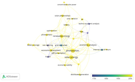 Figure 7 shows that the word “photovoltaic” is the most used by the authors, which appeared in 31 sample publications. The term “solar energy”, which is often used in conjunction with the term “photovoltaic”, is also widely used by researchers, with a number of 30 appearances in the sample. The terms “renewable energy” and “economic analysis” appear next, mentioned in 21 publications each. It is also possible to notice, thanks to the overlay visualization mode, that terms such as “net metering”, “techno-economic analysis”, and “homer”, for example, are being discontinued in these works. Conversely, new words are emerging and being used as keywords in the search for articles and reviews, such as “economic assessment”, “levelized cost of energy (LCOE)” and “self-consumption”, for example.