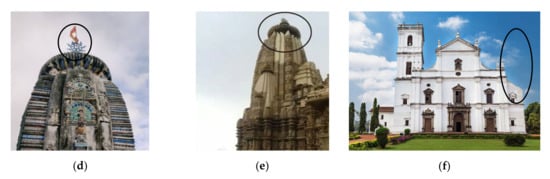 Figure 1 depicts snapshots of the damages caused to some important United Nations Educational, Scientific, and Cultural Organization (UNESCO) world heritage monuments that have been struck by lightning in India. In Brihadisvara Temple (Big Temple), in Thanjavur, one of the five spires (called kalasam) atop the Rajarajan gopuram (called also Thiruvayil), which is the middle gopuram from the entrance of the temple (Figure 1a) was damaged by a lightning strike [6]; the kalasam made of brick and lime mortar fell and broke into several pieces. Another example is the Jameshwar Temple (Bhubaneshwar) (Figure 1b), which experienced extensive damages from a lightning strike that caused a deep crack on the 11th-century temple’s wall on its exterior ornament [7]. In 2013, a lightning strike hit the Ratneswhwar Mahadev temple in Varanasi [8] (Figure 1c), which was extensively damaged and required a significant refurbishment. The Nilamadhab temple was hit by a lightning strike that caused damages to the sanctuary’s spire [9] (Figure 1d). Furthermore, a lightning strike hit the famous world heritage UNESCO site of Khajuraho, damaging the top part of the Devi Jagadambika temple (Figure 1e), inside the western group of temples [10]. Another important monument, the Charminar, was recently hit by a lightning strike. It was reported that the building was damaged several times by lightning strikes on its south-western minaret [11]. Reports have also mentioned that one of the 35 m high bell tower of the Se Cathedral (Goa) was extensively damaged by a lightning strike in 1776 (Figure 1f) [12].