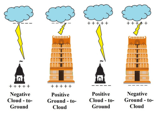 Lightning can be categorized into four types, namely negative cloud-to-ground (−CG), positive cloud to ground (+CG), positive ground to cloud (+GC), and negative ground-to-cloud (−GC), as illustrated in Figure 2. Among these, the positive cloud-to-ground (+CG) type is five to six times more powerful than the others, which can in turn cause extensive damage to structures [22,23]. Such severe lighting strikes due to +CG occur in stratified squall-line regions of thunderstorms, while the −CG lightning strikes are most common and occur during the monsoon. The upward-directed +GC and −GC occur invariably in very tall structures.
