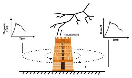 Figure 3 depicts the development of return stroke current on a grounded structure (considered to be a conductor) during a lightning strike and the resulting radiated magnetic field during the initiation of the return stroke, which develops within a few tens of microseconds. The nature of the upward-directed return stroke that is initiated during lightning is invariably along a vertical channel profile.