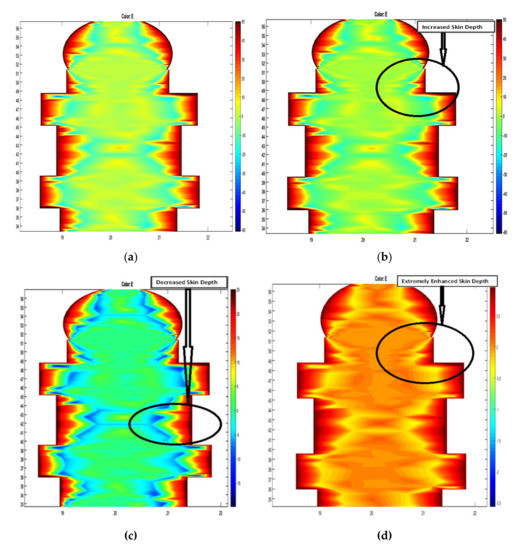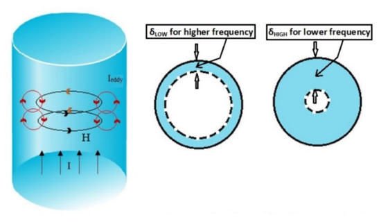 Figure 4 illustrates the concept of skin effect and hence the skin depth (depth of penetration) in an electrically conductive object; it can be argued that as the frequency of the excitation increases, the skin depth (penetration depth) of the component decreases.