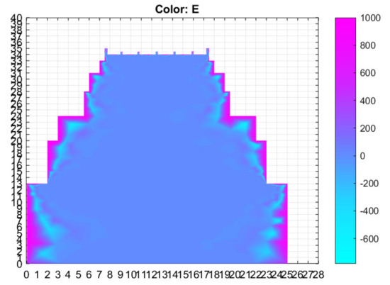 The electrical parameters used for the modeling and the simulation of the structure during lightning strikes are the following: σ (electrical conductivity) = 1 mS/m; εr (dielectric permittivity) = 6 and magnetic permeability = 16; frequency = 10 kHz. The 2-dimensional geometrical model of the structure is drawn with the scale in meters (m) and the output is shown as a color plot that represents the variations in electric field intensity (E) at the chosen frequency (f). The highest magnitude of electric field intensity is shown in pink and minimum magnitude of the electric field is shown in blue.