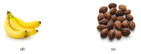 Organics used in mortar preparation: (a) fig, (b) jaggery, (c) black grape, (d) banana, and (e) kadukai.