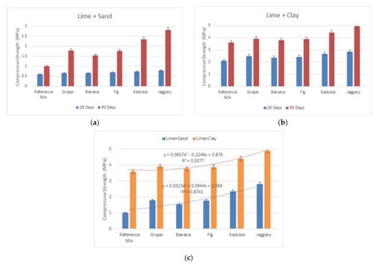 Compressive strength: (a) 28 and 90 curing days for lime–sand mixtures, (b) 28 and 90 curing days for lime–clay mixtures, (c) comparison between lime–sand and lime–clay mixtures at 90 curing days. Error bars indicate standard deviation. A multiple regression model was formulated using the compressive strength values; R2 values of 0.927 for lime–clay and 0.874 for lime–sand mixes were obtained, which established an excellent accuracy of the experimental values [56].
