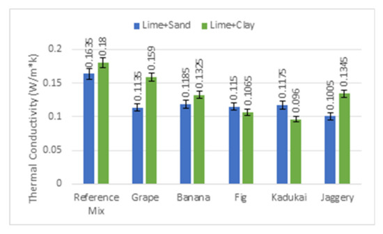 In the modified mixtures, the addition of organics reduced the thermal conductivity parameters for both lime–sand and lime–clay mixtures (Figure 8). In the grape, banana, and jaggery mixtures, lime–clay samples showed higher thermal conductivity than the lime–sand counterparts, except for fig and kadukai, for which the lime–sand mixtures showed higher thermal conductivity values than other mixes.