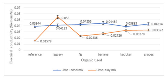Lime–sand mortars exhibited higher electrical conductivity respect to lime–clay mortars. Besides, the mixes with organics exhibited higher electrical conductivity compared to the reference mix. This behavior might be explained by the modified chemical composition of the paste imprinted by the organics, which increases the pH and enhances the movement of the electrons.
