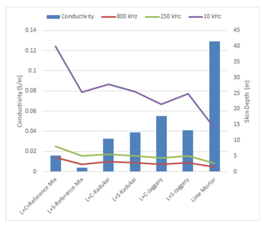 Electrical conductivity is usually a function of aggregate volume fraction, saturation, density, and pore size distribution [65,66]. The interconnection of material particles and interconnection among pores tend also to affect the electrical conductivity [67,68]. Moreover, the salinity of water used for mixing lime paste greatly influences the electrical conductivity. Generally, high water–cement ratios determine higher electrical conductivity due to an increasing of dissolved ions. The electrical conductivity values measured in the studied samples are summarized in Figure 9.