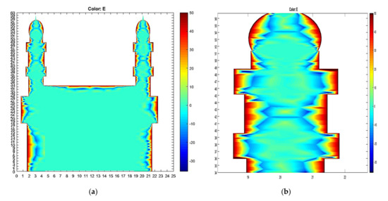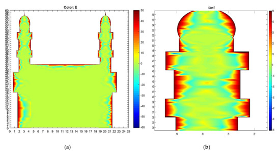 The results of the simulation for different mixes evidenced that organic mixtures (lime–clay + kadukai) displayed a decrease in the depth of penetration (skin depth), indicating their ability in ensuring better response to lightning strikes. This aspect is evident from the simulation result shown in Figure 16c, which indicates that the electric field gets graded from maximum (denoted by red color) to the less intense field (indicated in green) and gradually to the minimum (shown in blue).