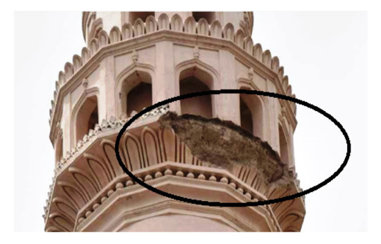 In respect to the Charminar monument, in 2019 a lightning strike caused the collapse of the south-west minaret, necessitating its restoration [11]. The damages’ photo documentation of the monument after the event (Figure 17) evidences crumbling and cracks on the stucco ornaments of the minaret [11], whose areas exactly correspond to vulnerable points evidenced by the simulation reported in Figure 16b, thus cross-validating the proposed model.