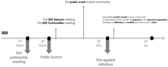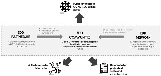 The partnership started on 17 March 2020, with a first meeting among the four organizations. This first stage was characterized by strong interactions, focused on articulating the objective of the partnership—this being the opportunity to offer a collaborative response to the COVID-19 crises based on the SDGs. This represents the partnership’s value proposition for EDD. The first public event presented the initiative on 25 March, when a call for collaboration of organizations to create an EDD Network was released, with the first meeting of the network held on 2 April. Just four days later, on 6 April, four communities had been created: Global Governance and Cooperation for Development; Cities; Health & Environment; Inequalities and New Economic Models. Each community comprised a core team of 10 people drawn from public and private decision-makers with civil society leaders. Communities were coordinated through one cross-community meeting and one community-specific meeting per week. In addition, three virtual spaces were opened to help communities progress and amplify their impact: (i) Agora, a hybrid space for conversations and interpretation among actors with diverse sensibilities; (ii) Workshops, a co-design space for positioning on a topic with experts from a community, and (iii) CoLab, a mass interaction space for activation of collective intelligence through prototypes. Through virtual spaces, each community held its first public event to set the vision of the community and position the initiative in a specific response to the COVID-19 area of work. On 25 May, once the communities had consolidated their direction of work and grown in number to approximately 20 members per community, which incidentally coincided with the start of the COVID-19 de-escalation and reopening process in Spain, the partnership progressed to the second stage of “maturity”. A transition process was then held to reorganize the internal team and better support communities in a mid-term scenario with two priorities: to consolidate trust and shared purpose within communities and to launch the first transformative actions. Since then, communities have focused on designing demonstration projects at scale, involving stakeholders and promoting cross-learning among projects. Figure 2 synthesizes the timeline of the different EDD steps.