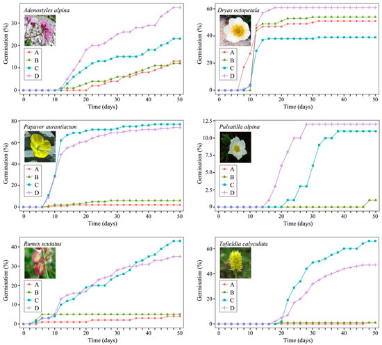 Germination lines for tested species (excluding Laserpitium krapfii, L. peucedanoides and Silene glareosa) given various treatments: A, water (control); B, water and CaCO3; C, GA3 solution; D, CaCO3 and GA3 solution. The A and B lines of treatments of Pulsatilla alpina are overlapped.