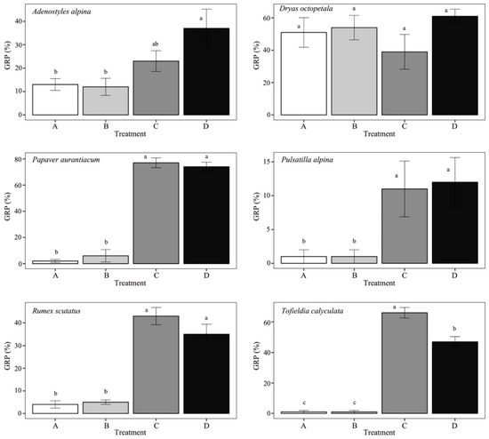 In all these cases, the treatments with GA3 significantly increase GRP, except for the case of Dryas octopetala. Only for Tofieldia calyculata is there a difference between treatments C and D with a greater GRP in C, while for Adenostyles alpina the treatments without GA3 (A and B) are significantly different only compared to D, which is the treatment with the highest GRP value. For no species is GRP significantly different between the control (A) and the treatment with the addition of only CaCO3 (B).