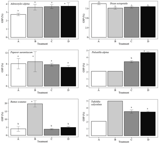 In Table 1, the one-way ANOVA results show that for most species treatment has a significant effect on GRP and GSP. Only for Dryas octopetala does the type of treatment have no significantly different effect on GRP, nor does it have a significantly different effect on GSP for Adenostyles alpina and Papaver aurantiacum.