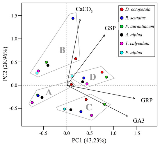 PCA biplot of the species grouped according to germination treatment: A, water (control); B, water and CaCO3; C, GA3 solution; D, CaCO3 and GA3 solution. The first two axes (PC1 and PC2) explain 72.19% of the total variance in the dataset. Key: GRP, germination percentage; GSP, germination speed coefficient; GA3, gibberellic acid; CaCO3, calcium carbonate.
