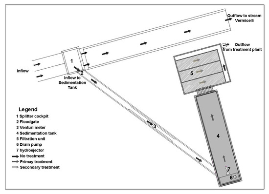 The sedimentation tank is responsible for the treatment of the coarse particles transported by the stormwater. The filtration unit carries out the task of retaining particles of lower dimension (diameter <20 µm) [29]. The outline of the experimental apparatus is shown in Figure 2. Its elements are: