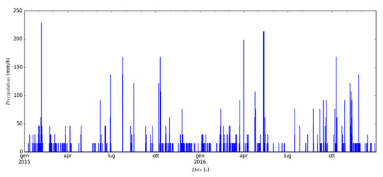A preliminary precipitation analysis was carried out to hydrologically characterize the catchment. Besides a two-year-long precipitation time series, starting on 1 January 2015 and ending on 31 December 2016, was selected for the analysis. The precipitation data were recorded every 1 min by a tipping-bucket rain gauge with a resolution of 0.254 mm and simultaneously saved on a hardware placed on site. Rain data were preprocessed for the identification of missing data and outliers and stored in an SQLite database for fast querying and analysis. The hydrological characterization of the recorded time series of observations was carried out in Python language. In particular, the duration, the peak and the total volume of single rainfall events were extracted. A Minimum Inter Event time of 3 h was adopted to identify independent events. Only precipitation events with a total volume higher than 5 mm were considered in the following analysis.