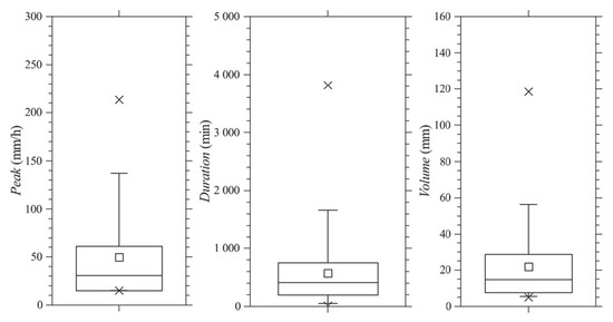 The analysis of the precipitation time series led to the identification of 107 independent rainfall events. Results are reported in Figure 5, in which a box plot for each variable of interest (i.e., peak intensity, duration and volume) was used to summarize the statistics of the analyzed sample. The average peak intensity (quadrangle in the left plot) was 49.7 mm/h, while the 75th percentile was 61 mm/h. The average duration and volume were 574 min and 21.9 mm, respectively. A comprehensive analysis of the main statistics of the sample is shown in Table 2. Interestingly, only 8 rainfall events were subhourly. However, it must be emphasized that subhourly events were characterized by an average peak of 68.5 mm/h, which is significantly higher than the average value of the whole sample (i.e., 49.7 mm/h).