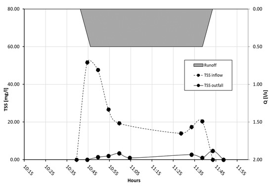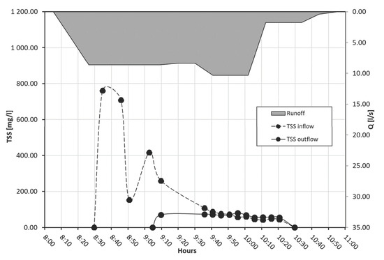 The TSS concentration measured in the rainwater flowing into the sedimentation tank showed a maximum value of approximately 450 mg/L, during the first moments of runoff. Later, the value remained constant with concentrations below 100 mg/L. The high value of TSS in the first moments of runoff were probably due to the first flush phenomenon while the TSS concentration measured in the water outflowing from the sedimentation tank was constant and lower than 50 mg/L.