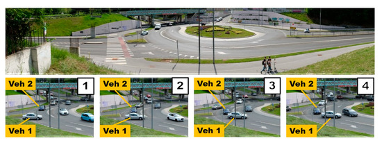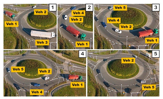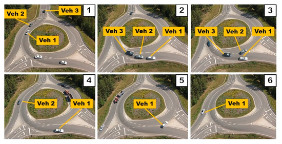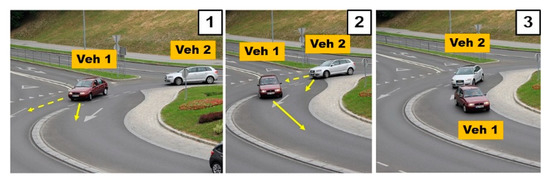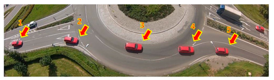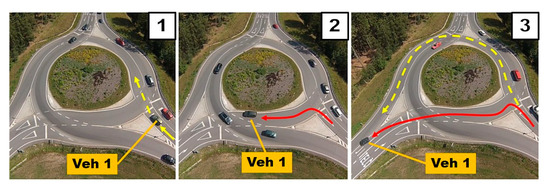 - Step 1: Vehicle 1 arrives at the turbo-roundabout. It stops at the entrance to the circulatory roadway. The vehicle should continue in the direction of the dashed arrow. Vehicle 1 stands at the entrance for approximately 4 s, and there are no vehicles on the circulatory roadway.