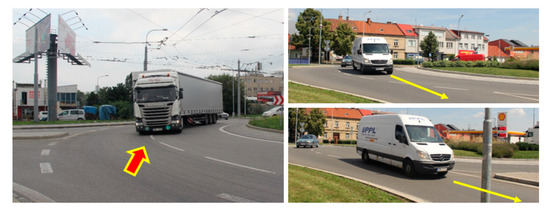 - Graphic evaluation is then performed by depicting traffic conflicts, e.g., in a ground scheme or in a photograph from a video recording. When using schemes, it is advisable to use two of them. In the first one, appropriate signs indicate the location of the traffic conflict as accurately as possible, and the number of these signs indicates the frequency of the conflict. The second scheme then shows a simplified course of the conflict, from which, among other things, the direction of travel of vehicles and the place of emergence of the conflict are clarified. The use of schemes is suitable for high frequencies of traffic conflicts. On the contrary, at low frequencies or to explain the course of the emergence of the conflict, the use of photography is sufficient (see the figures in Section 3).