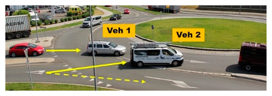 - Step 1: Vehicle 1 should continue in its lane as indicated by the dashed arrow. Vehicle 1 suddenly brakes and changes its trajectory to the inner lane. Vehicle 2 arrives at the entrance to the turbo-roundabout.