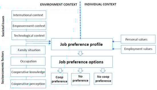 Based on the previous discussion, we propose a model (Figure 1) which aims to answer the following research question: How do different millennial university student profiles explain the job preference of pursuing a career in a cooperative organization versus working in other institutional forms or not having preferences at all?