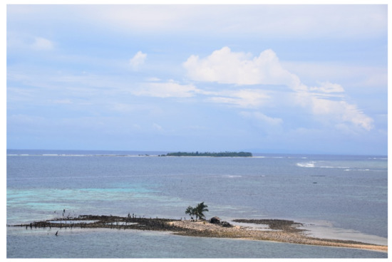 Two Lau communities, Walande and Fanalei, are located on South Malaita, approximately 130 km south of Lau Lagoon. At least 12 generations ago, people settled here to hunt dolphins [19]. The porpoises are killed for their teeth, which are used for customary marriage and compensation payments, and for their meat, which is an important source of income and food for these communities. These two islands feature prominently in the climate change discourse in Solomon Islands as prime examples of sinking islands [30,31] (see Figure 4). Approximately 750 people now live in these two communities.