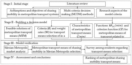 The paper is organized as follows. Section 2 includes a review of the literature on the aspects raised in the article. The problem is discussed with particular emphasis on metropolitan transport integration and the growing share of pro-ecological concepts in mobility management, including the share of sharing mobility ideas in the space of transport systems. Section 3 describes the research approach and indicates the applied methods. It also presents a diagram illustrating the course of research divided into individual four stages. Section 4 includes an essential part of the article related to building the model of metropolitan transport means selection. Section 5 is devoted to model verification among the research area in Silesian Metropolis. The analysis covered multi-criteria decision on metropolitan transport means selection, which allowed to present a ranking list of available variants. The results were presented in the form of charts, and additionally, detailed data were presented in tables. Finally, Section 6 is devoted to the discussion of the results and conclusions.
