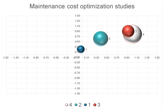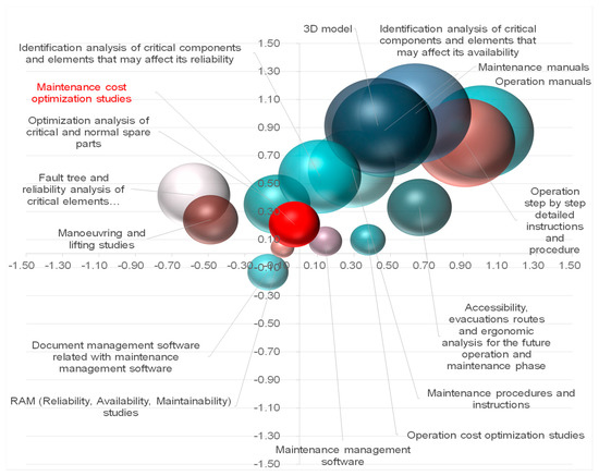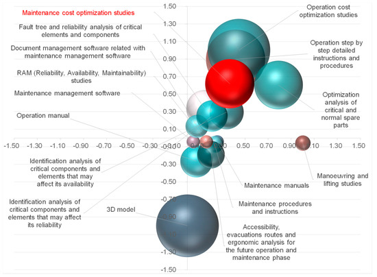 Figure 4 represents the relative evaluation of the professionals that participated in the questionnaire under the “contractor” profile about the criteria “maintenance cost optimization studies” (in red), compared with the rest of the criteria analyzed. Each sphere of the graph represents each of the evaluated criterion, making it possible to compare the interest that each one generates on the contractor side. It can be observed that most of the criteria are located at the top of the graph, meaning that the contractor would be willing to assume some cost to implement them. Regarding the interest perceived, the answer was also mostly positive, as most of the spheres are located in the right side of the graph. Furthermore, considering the size (diameter) of the spheres, the most valued criteria were “3D Model”, “Identification analysis of critical components and elements that may affect its availability”, “Maintenance manuals”, “Operation manuals”, and “Operation step by step detailed instructions and procedure”.