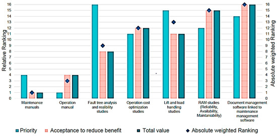 In order to make it easier to read the trend, only some of the evaluated criteria have been represented. As an example on how to understand in the information shown, the criterion “Fault tree analysis and reliability studies” was the one that the contractor assigned the least priority (number 16 of 16), but the overall priority placed it in the 8th position of 16 criteria.