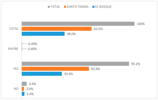 Figure 2 describes that 95.2% of the surveyed students affirmed that EE must be part of the study plan; 59.6% from Santo Tomás University and 35.6% from El Bosque University. As random and independent samples were taken in each of the two universities studied, it can be affirmed with 95% confidence that between 89% and 94% of the students from El Bosque University have indicated the importance of a subject focusing on EE within the study plan, while in Santo Tomás University, this rate is between 93% and 99%.