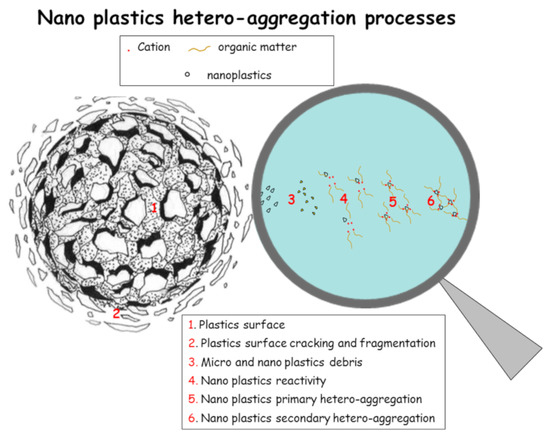 Despite the fact that plastics differ for their chemical composition (acrylonitrile butadiene styrene, acrylonitrile/methyl methacrylate, acrylonitrile-styrene-acrylate, high-density polyethylene, low-density polyethylene, polypropylene, polystyrene, polyvinyl chloride, polyvinyl butyral), their behavior in the soil mainly depends on their physical properties. Indeed, the reactivity of plastics depends on their crystalline structure; for example, plastics with low values of crystalline/amorphous ratio are more reactive compared to those with high ratio values. This could be due to the higher pore surface and higher adsorption of chemicals which may enhance their degradation and the formation of additional secondary MPs and NPs [11]. As mentioned above, MPs and NPs differ for their size and thus for their surface/volume ratio, with nanoplastics having a higher chemical reactivity and mobility than MPs and a different colloidal behavior [14,15]. The colloidal property influences the stable or unstable hetero-aggregation of NPs, which also depends on the ionic strength and pH value of the solution and thus it should depend on mineral composition and organic matter content of the soil [15] (Figure 1).