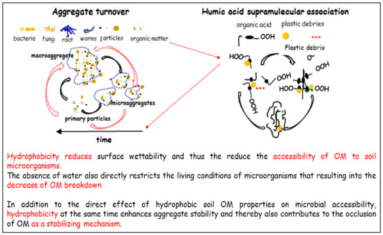 The presence of MPs and NPs in soil aggregates can alter biological, chemical and physical properties of soil [85,86,87,88], and affect the estimation of soil carbon sequestration [89]. The effect of plastics on soil aggregate formation and humic acids properties are shown in Figure 3. Indeed, Atuanya et al. [87] observed that the addition of plastic granules to soil increased the total organic carbon content of soil because the current methods used to quantify the soil organic carbon also determine the invisible MPs fraction of soil aggregates (e.g., polystyrene or polyethylene contain almost 90% carbon) [90]. Therefore, Rillig [90] recommended re-evaluating what is the “true” soil carbon storage in plastic polluted soils. De Souza Machado et al. [91] studied the effects of MPs with different shape, density and chemical composition, on the bulk density, water holding capacity, water stable aggregates and microbial activities of the soil. The authors concluded that micro-plastic could potentially trigger functional changes in soil that are difficult to be predicted due to the complexity of the soil system. However, the effects of MPs properties were not taken into consideration.