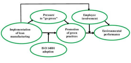 - LM requires the engagement of operators [15,26] in tasks such as problem-solving and process improvement. Otherwise, lean practices such as pull production [15,29] with limited physical inventory would be impossible to achieve. Consequently, lean companies try to engage employees and change work habits by means of employee-empowerment and teamwork techniques [49] (which match the requirements of green human-resource management practices [2], aligned with environmental goals [16,50]). Due to people’s commitment, after the implantation of LM, the ability to identify and eliminate sources of waste is extended to environmental issues without the need for other specific methodologies [51].