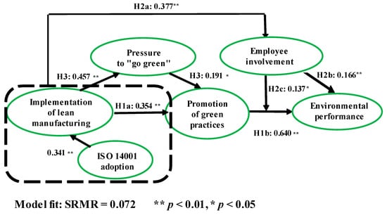 | H2b | Employee involvement -> Environmental performance | 0.166 | 2.925 ** | Supported |