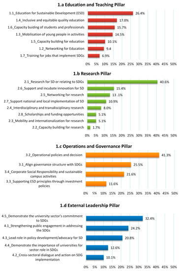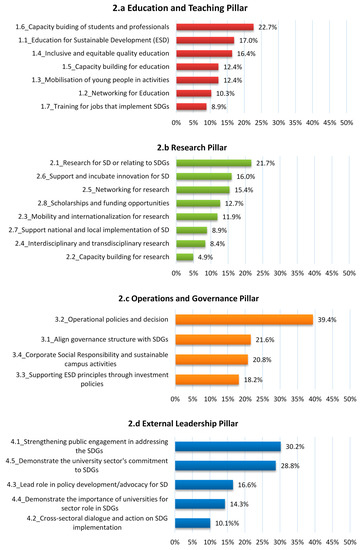 - The fourth pillar, External Leadership, aims to underline the key role that universities can play within communities, guiding and supporting local, national, and international response to the SDGs. The journey to sustainable development is based on the involvement of civil society, the business sector, and the scientific and academic communities. The collaboration between these different actors needs significant leadership and the capacity to understand the socioeconomic scenario. Universities have a central position in civil society, which makes them potential leaders in SDG-oriented projects.